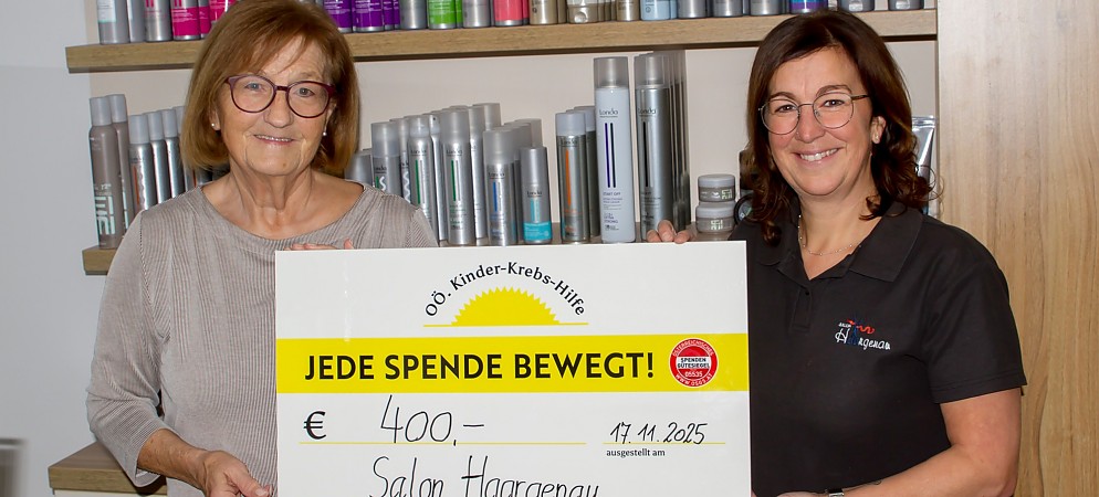 Anstelle der kleinen Weihnachtspräsente an ihre Kunden spendet heuer der Hofkirchner Salon Haargenau einen Betrag von € 400 an unseren Verein, die OÖ. Kinder-Krebs-Hilfe. Geschäftsführerin Manuela Wimmer überreichte dazu symbolisch einen Spendenscheck an Johanna Hauder, ehemaliges Vorstandsmitglied der OÖ. Kinder-Krebs-Hilfe. Unser herzliches DANKESCHÖN für dieses…