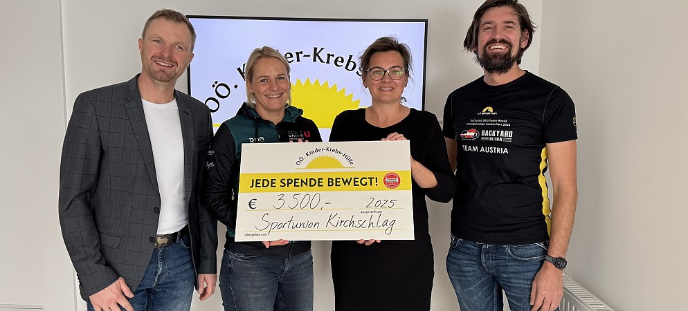 Unser herzlicher Dank für die Spende in Höhe von 3.500 Euro von Sportunion Kirchschlag bei Linz, die im Rahmen des Austria Backyard Ultra 2025 in Kirchschlag erreicht werden konnte. Wir danken den Organisator:innen, allen Teilnehmenden und allen, die diese Veranstaltung und Spende möglich gemacht haben! Am Foto (von links): Günter Kaiser (Bgm. Kirchschlag), Maja Nimmervoll (Sportunion Kirchschlag), Karin…